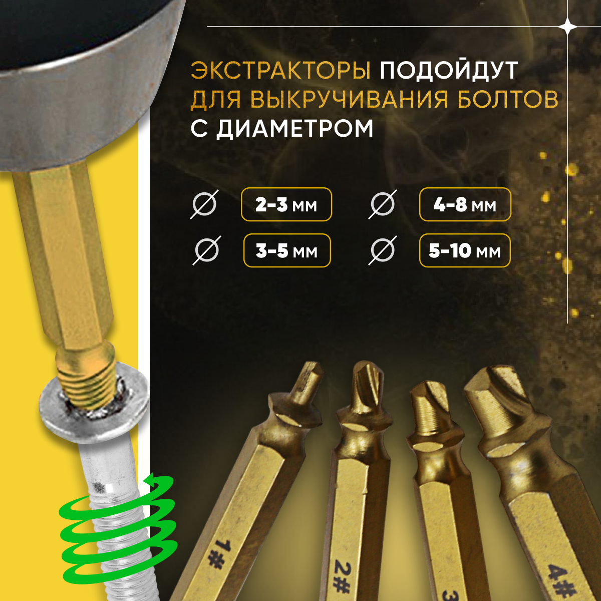 Экстрактор для болтов, набор для выкручивания сломанных саморезов, для извлечения сорванных шурупов 4шт информация: