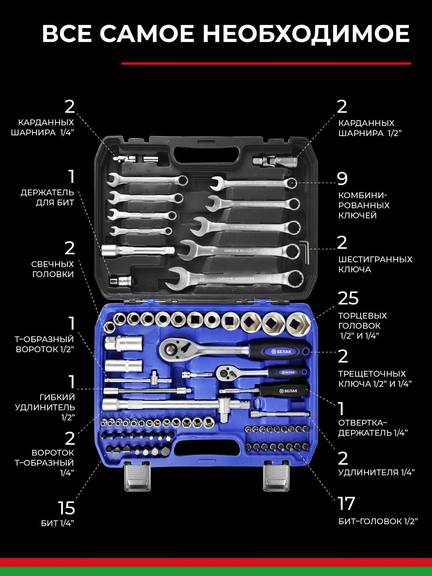 Набор инструментов для автомобиля и дома в кейсе 84 предмета "PRO" БАК.07009 БелАК информация: