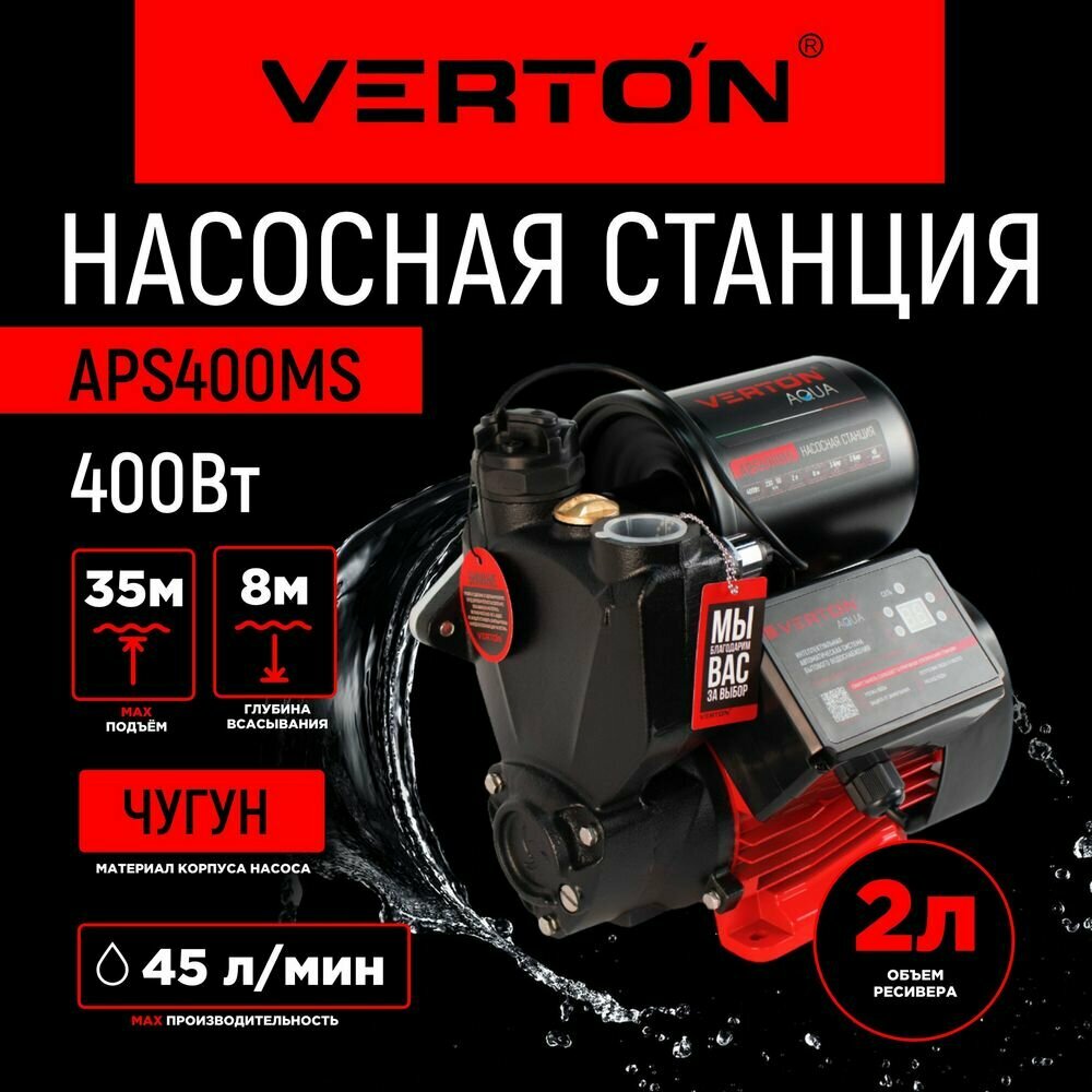 Отзывы на Насосная станция Verton AQUA APS400MS (400Вт, 43л/мин, 2л, гл. 8м, H 35м, вых. 1", 1.5 бар,дисплей)