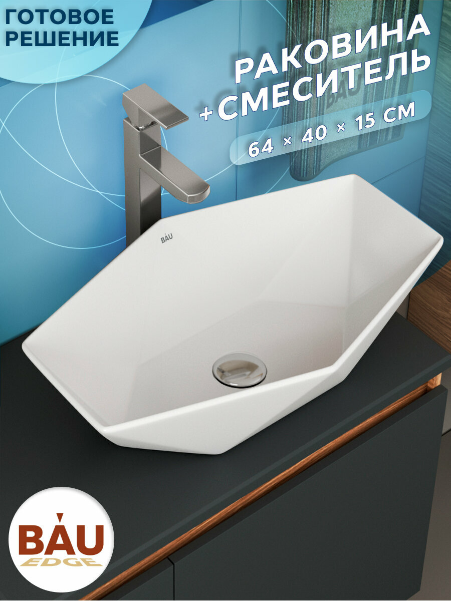 Раковина накладная со смесителем (на столешницу BAU Crystal 64х40, белая + смеситель Hotel Still, нержавеющая сталь) информация: