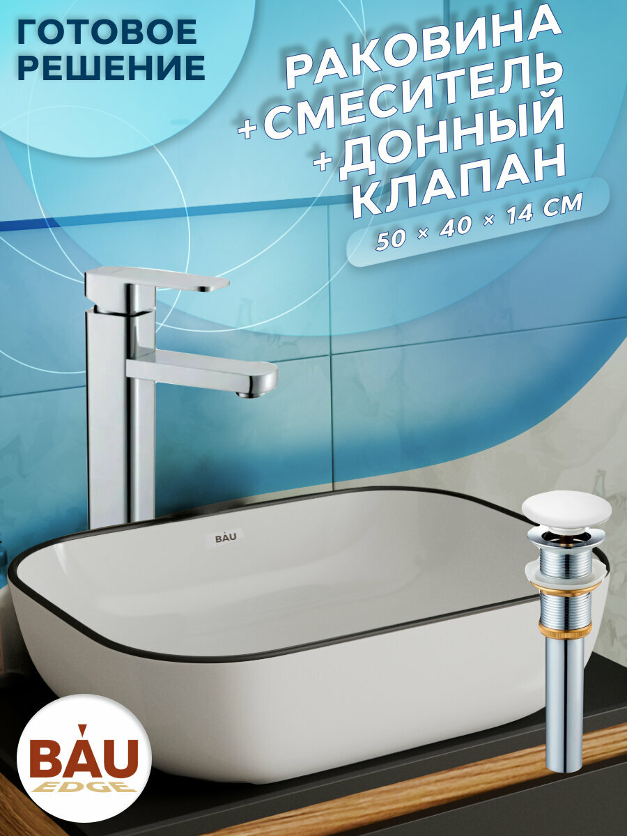 Отзывы на Раковина накладная со смесителем и выпуском (прямоугольная BAU Stil 50х40, белая + смеситель Hotel Still, нер. сталь, выпуск клик-клак белый)