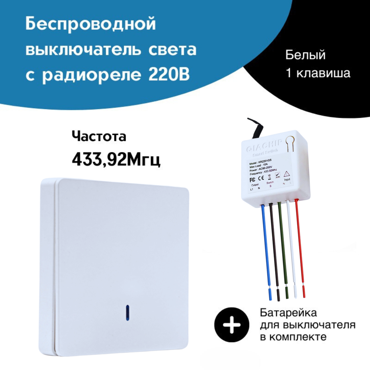 Беспроводной выключатель света – (1 клавиша с батарейкой + радиоуправляемое реле 220В 10А 433МГц) информация: