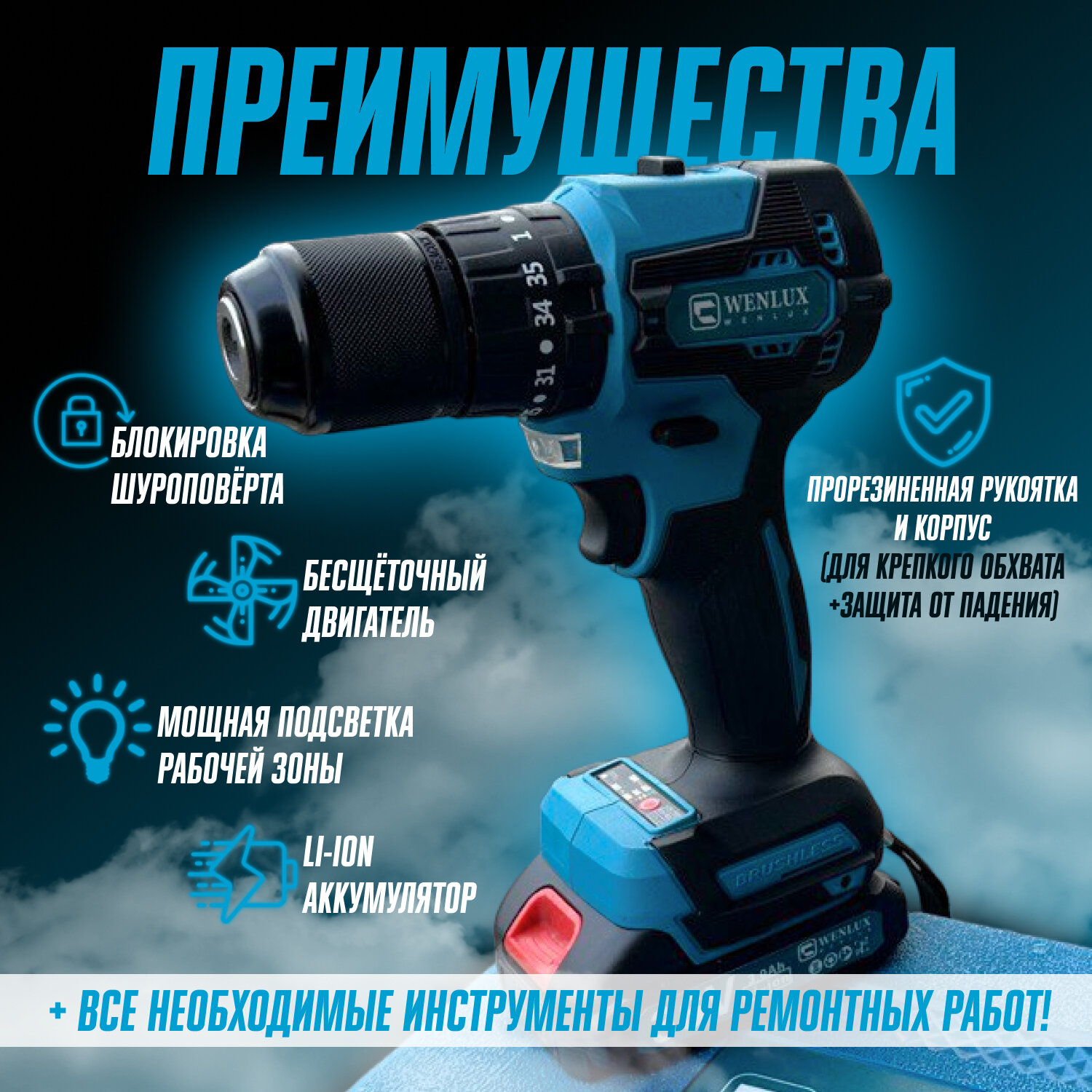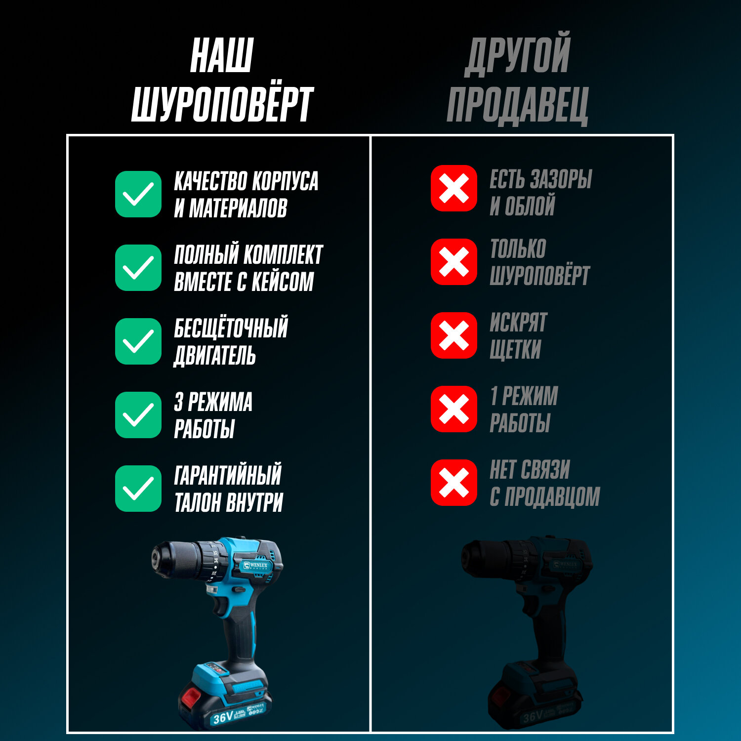 Отзывы на Дрель - шуруповерт акуумуляторный ударный 13мм - 1300AH - 36V WENLUX + набор аксессуаров