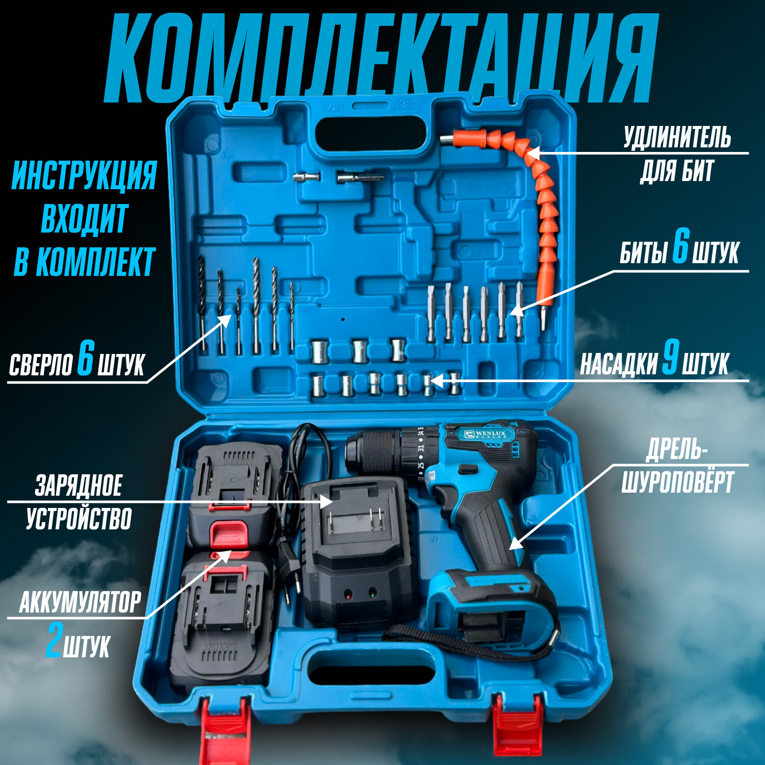 Дрель - шуруповерт акуумуляторный ударный 13мм - 1300AH - 36V WENLUX + набор аксессуаров информация: