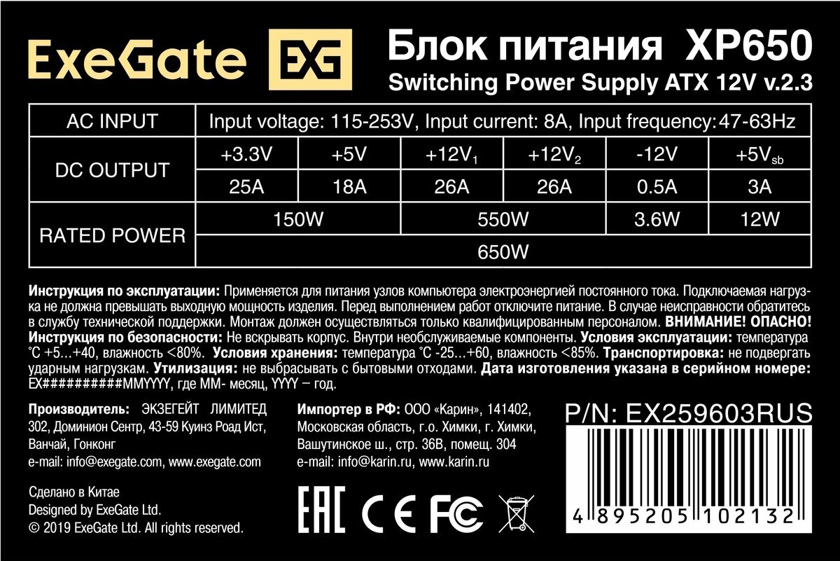 Блок питания Exegate EX259603RUS-S XP650, ATX, SC, black, 12cm fan, 24p+4p, 6/8p PCI-E, 3*SATA, 2*IDE, FDD + кабель 220V с защитой от выдергивания информация:
