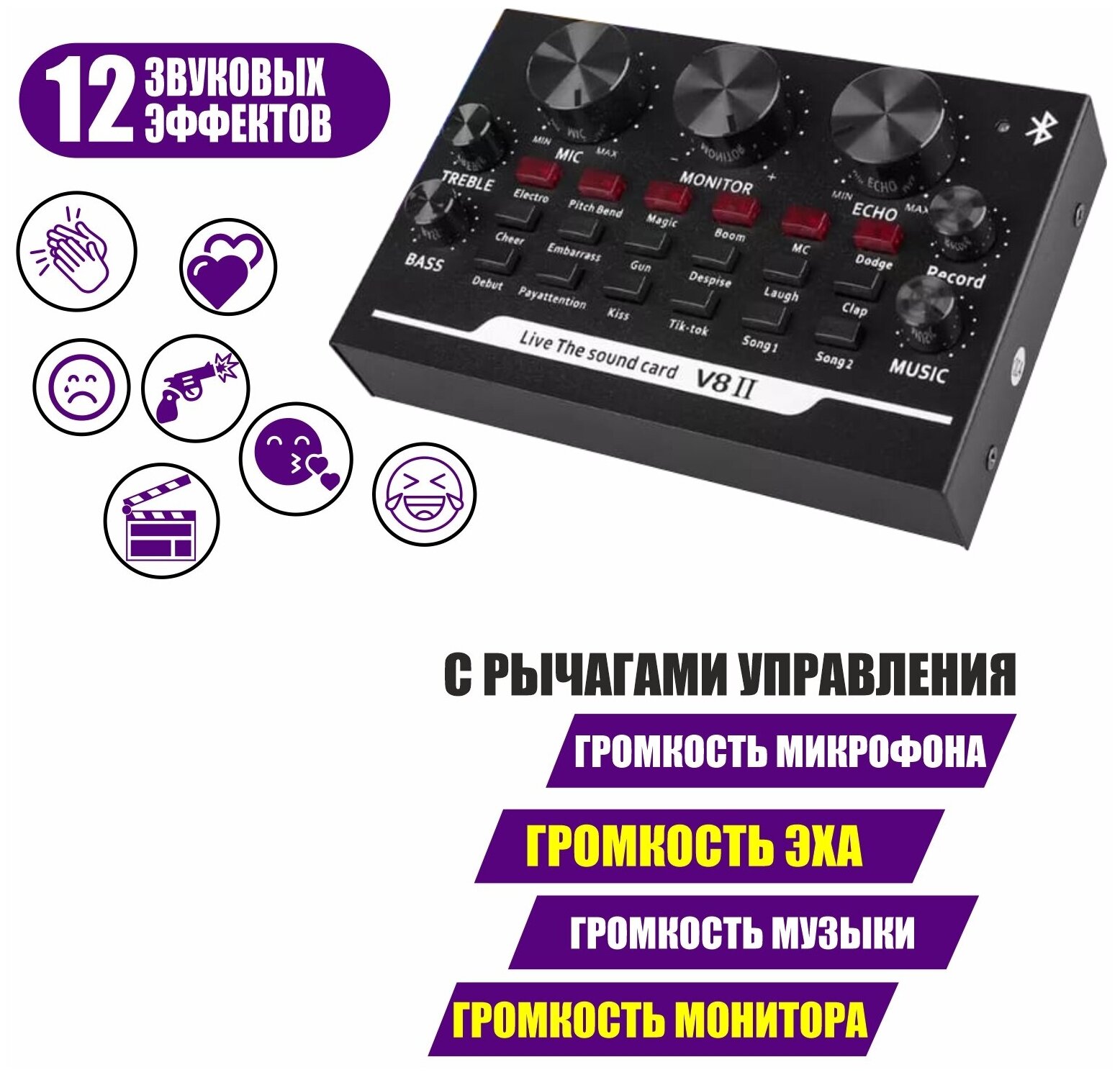 Внешняя звуковая карта V8 II, микшер с возможностью подключения к компьютеру и Bluetooth информация: