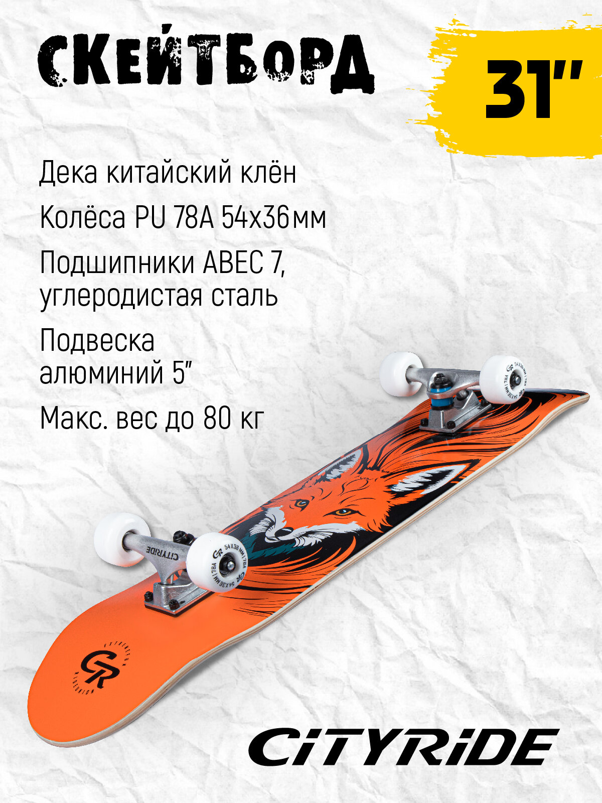 10 цен на Скейтборд ТМ City-Ride, дека клен 9 слоев, размер 31"*8", колеса: 54*36мм, PU, ABEC-7, JB4200183