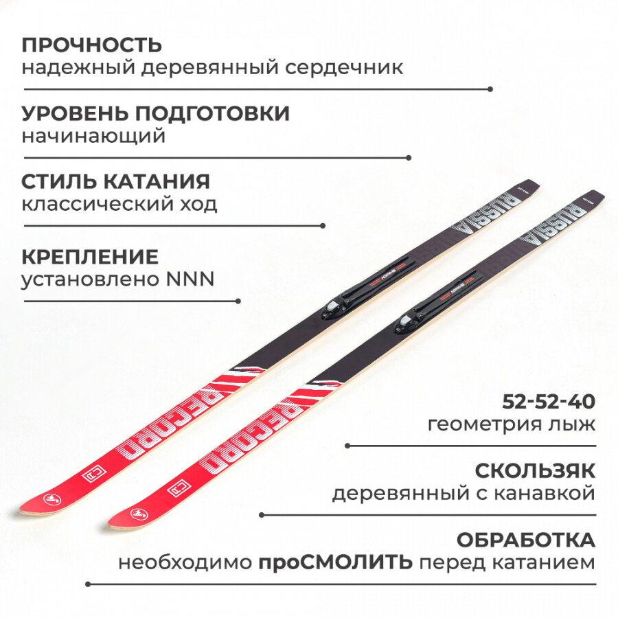 | Дополнительная информация | Скользящую поверхность деревянных лыж необходимо смолить или обрабатывать специальным составом для предотвращения намокания древесины, не менее 1 раза в сезон |