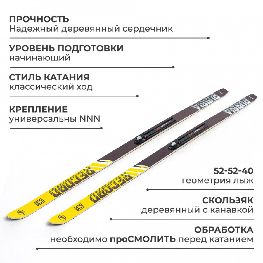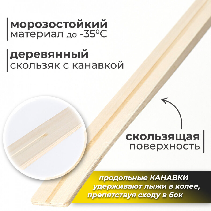 | Дополнительная информация | Скользящую поверхность деревянных лыж необходимо смолить или обрабатывать специальным составом для предотвращения намокания древесины, не менее 1 раза в сезон |