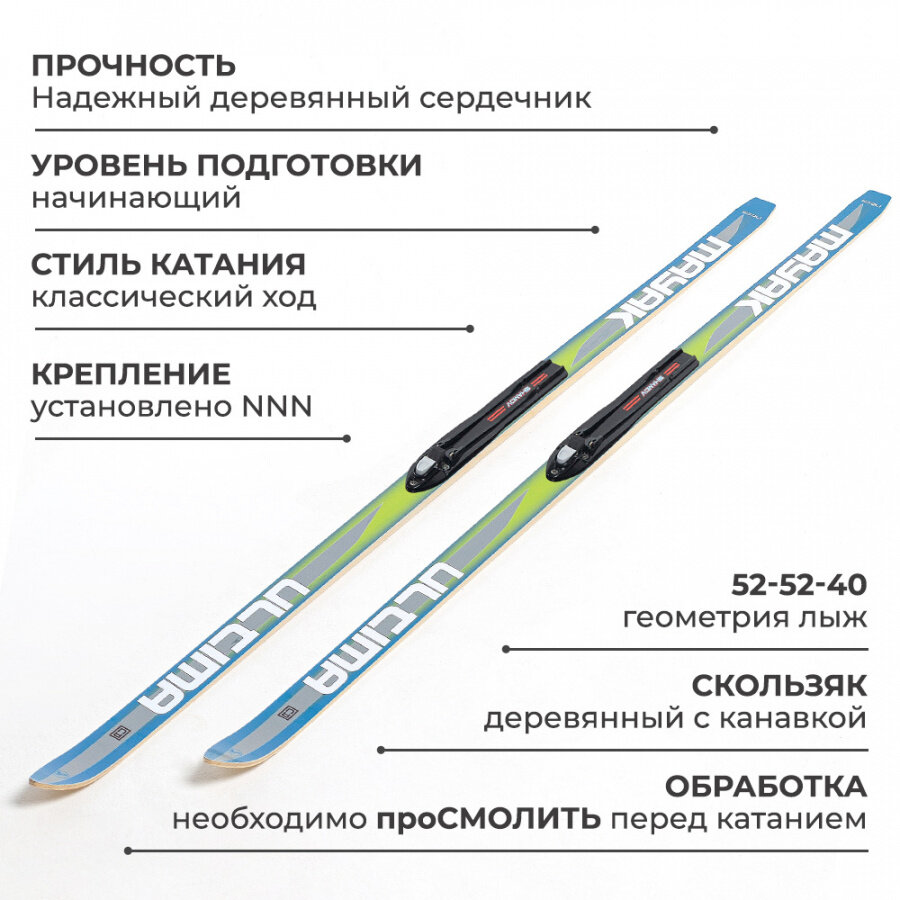 Отзывы на Беговые подростковые деревянные лыжи Маяк 170 см с креплением NNN, сине-зеленые