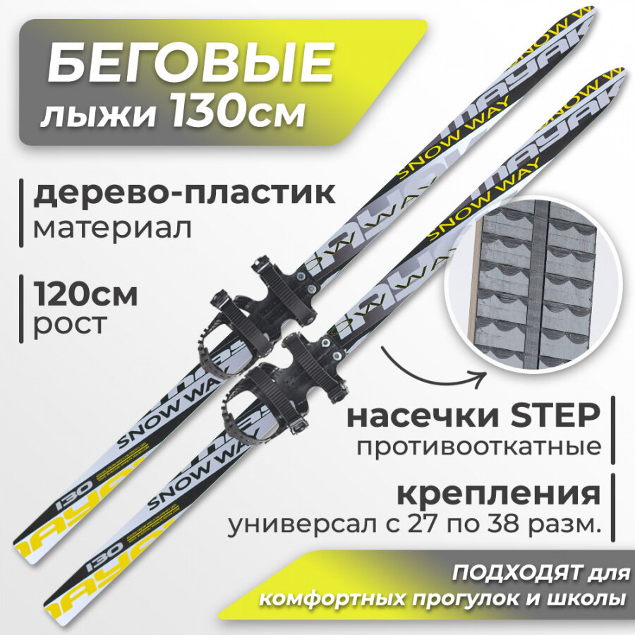 Лыжи беговые подростковые Маяк 130 см дерево-пластик (с насечками) с универсальными креплениями, серые информация: