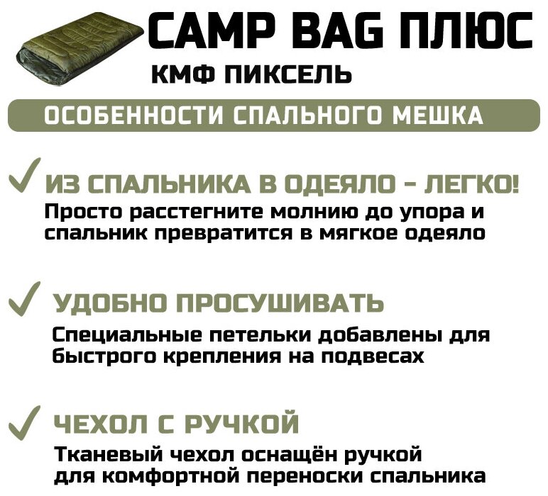 Спальный мешок с подголовником Prival Camp bag плюс, до -5C, 220х90см, камуфляж Пиксель информация: