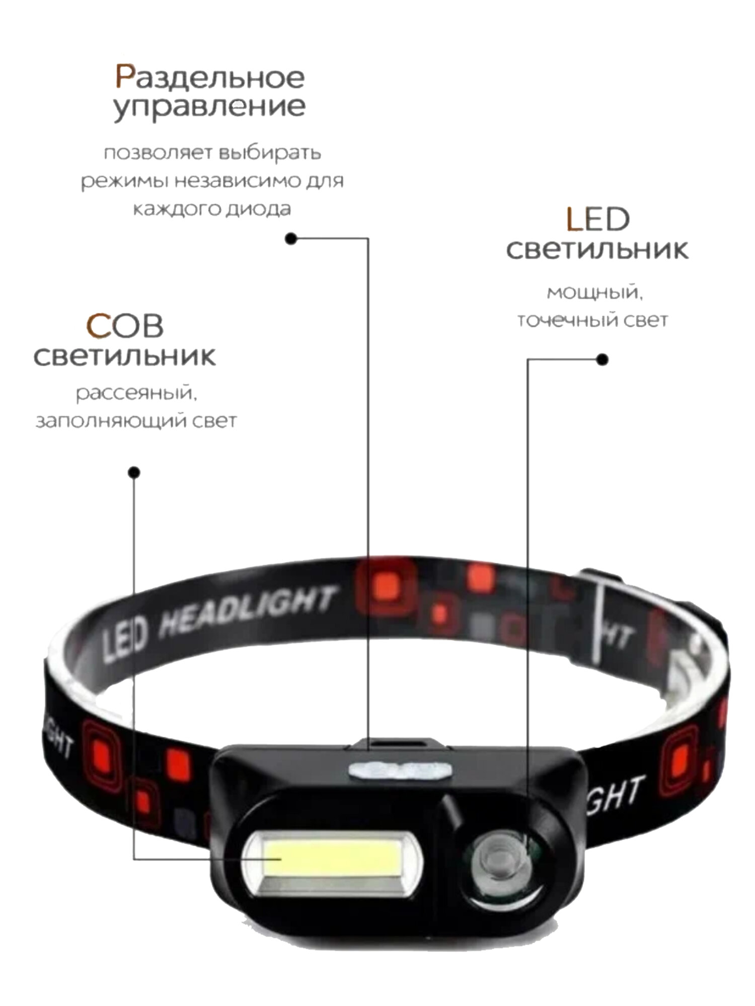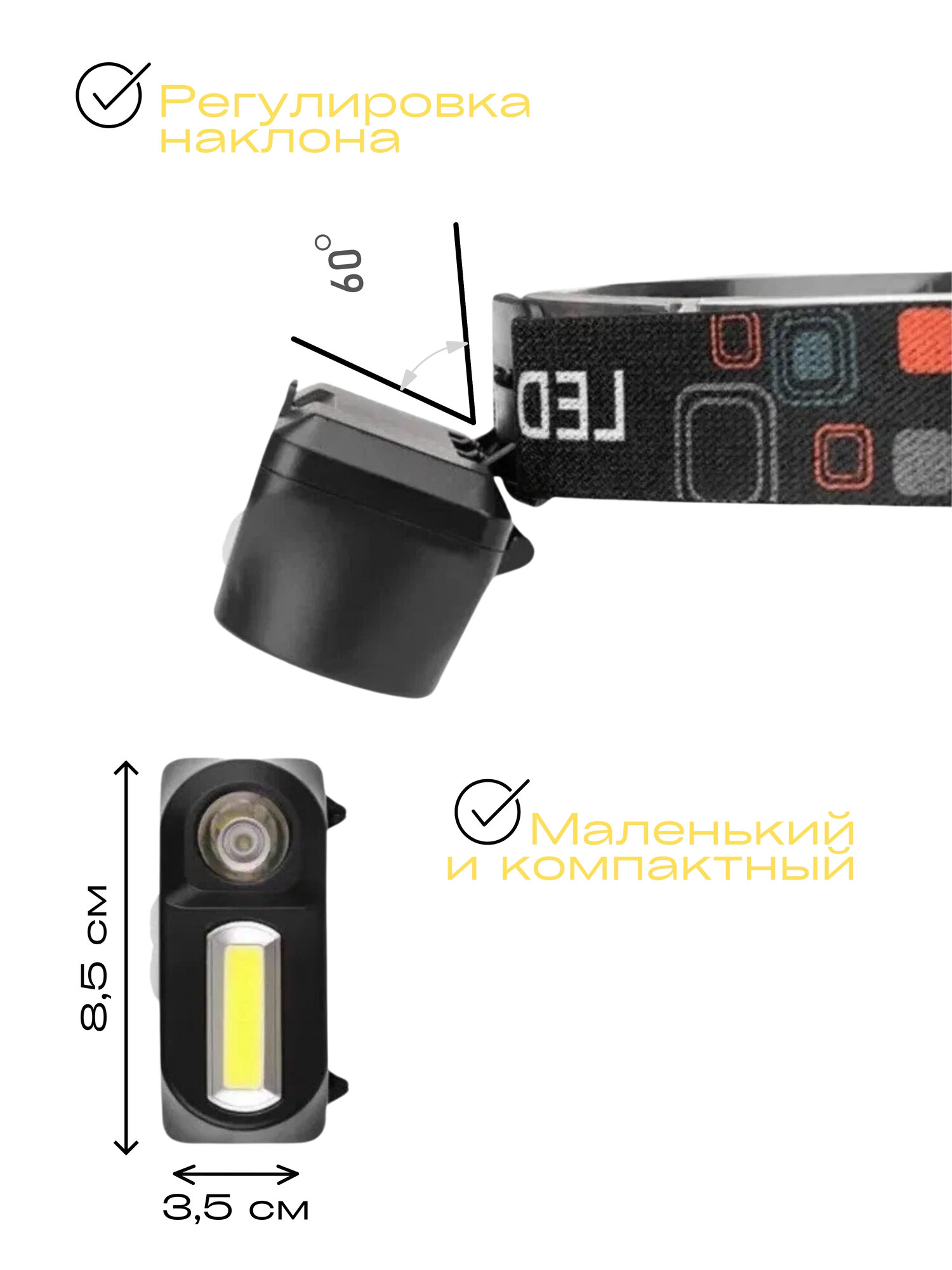 Фонарь налобный светодиодный аккумуляторный мощный с зарядкой USB регулировкой угла свечения информация: