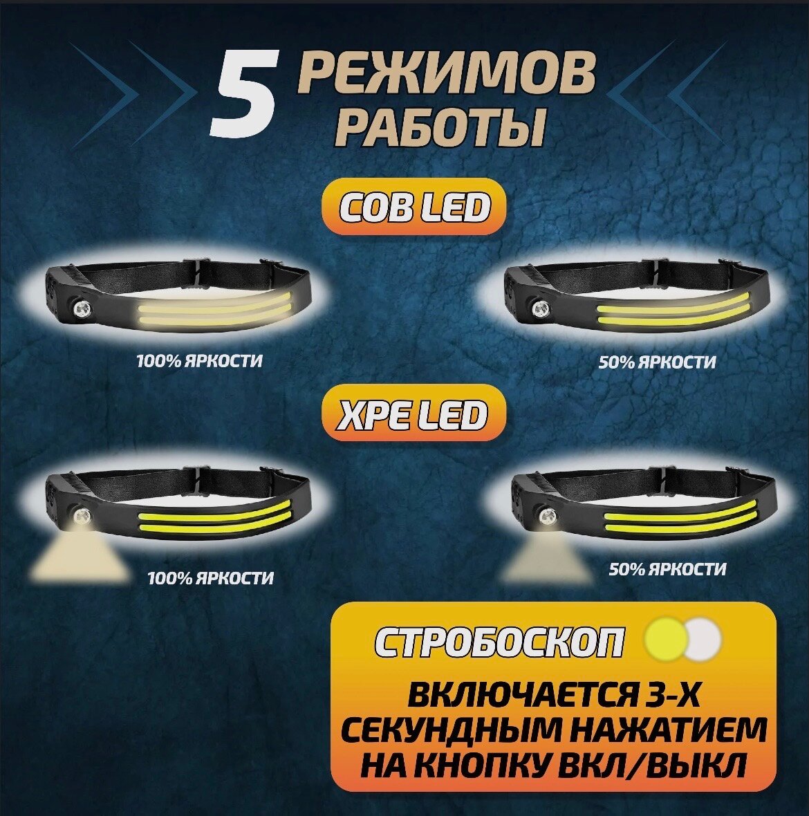 Фонарь налобный светодиодный аккумуляторный мощный с зарядкой USB регулировкой угла свечения