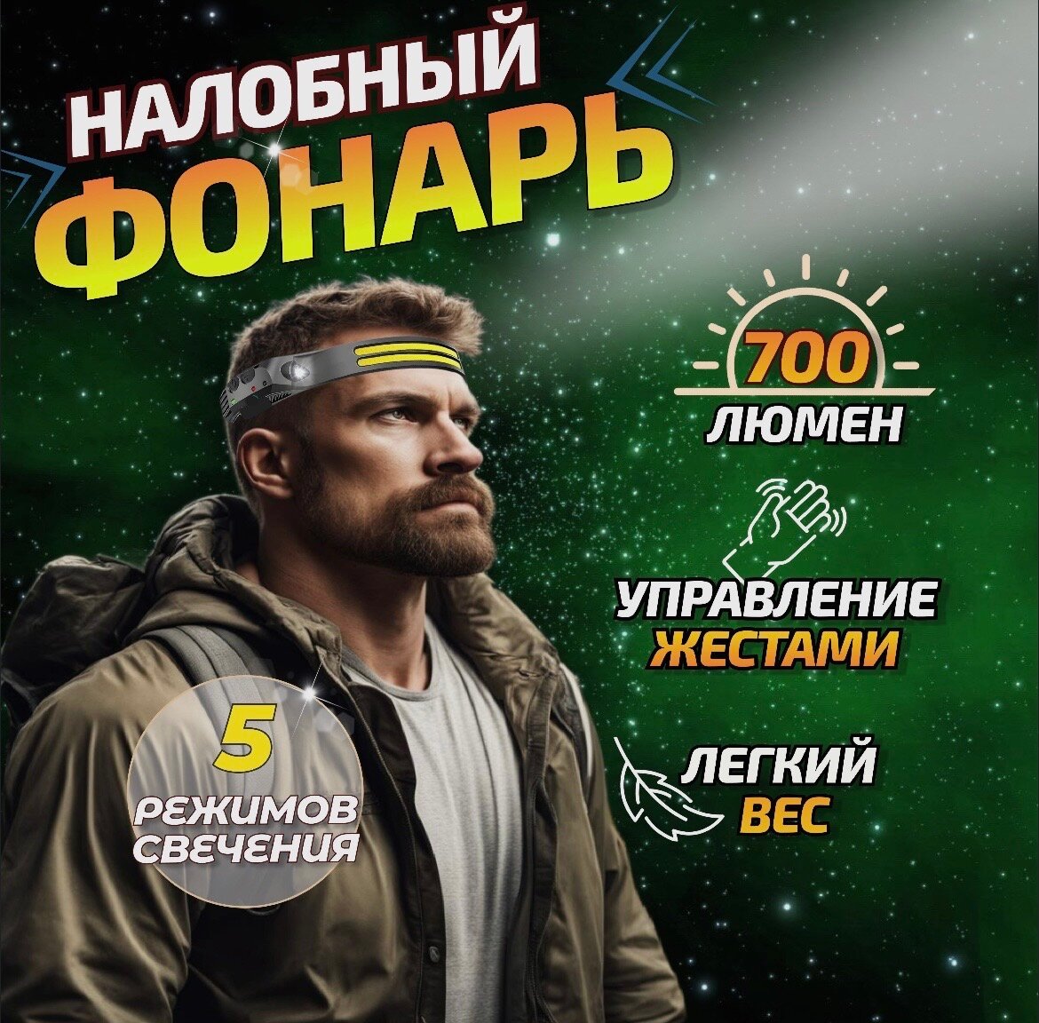 Гибкий налобный светодиодный фонарь Огонь, 5 режимов, Type-C зарядка, включение по взмаху. информация:
