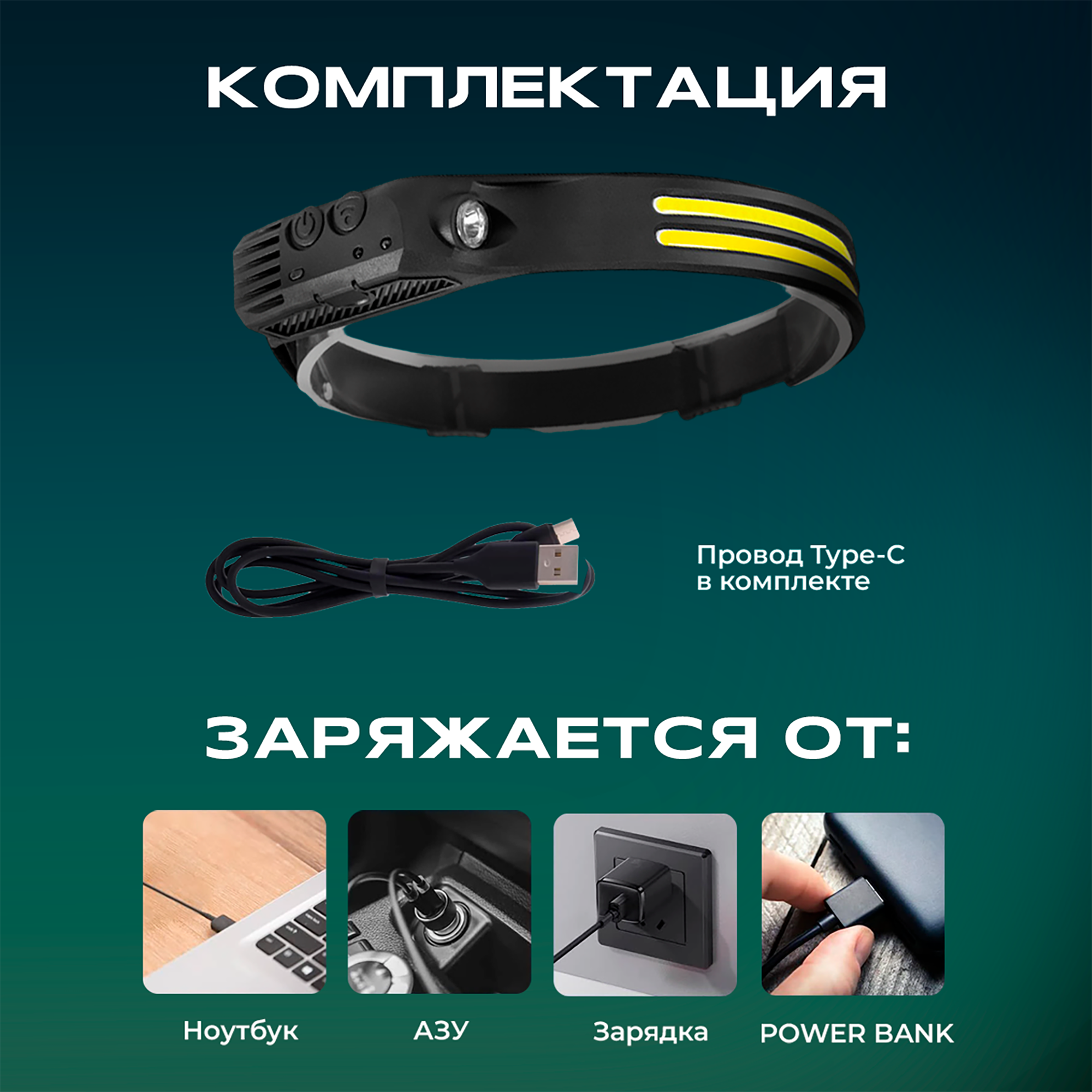 Налобный фонарь, магнитное крепление, черный, usb-зарядка, белый свет