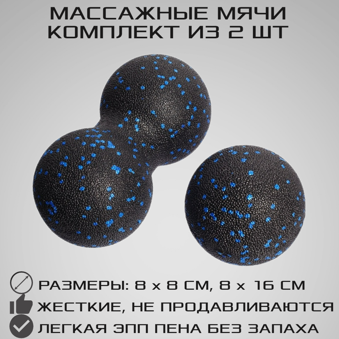 Набор спортивных массажных мячей для МФР STRONG BODY, черно-синий: 8 см, 8х16 см, классический и сдвоенный (массажный ролик, валик, мяч для МФР) информация: