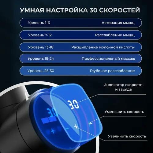 | Дополнительная информация | Перкуссионный массажер в кейсе для спортсменов 30 уровнями интенсивности массажа. Мышечный массажный (ударный) пистолет 6 насадок в комплекте. |