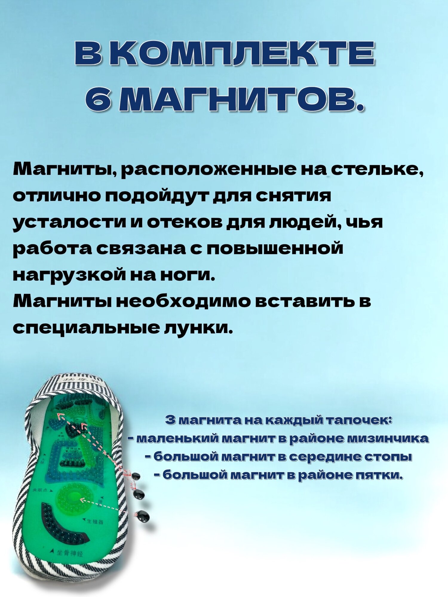 | Подробная комплектация | Тапочки, комплект магнитов (6 шт) |