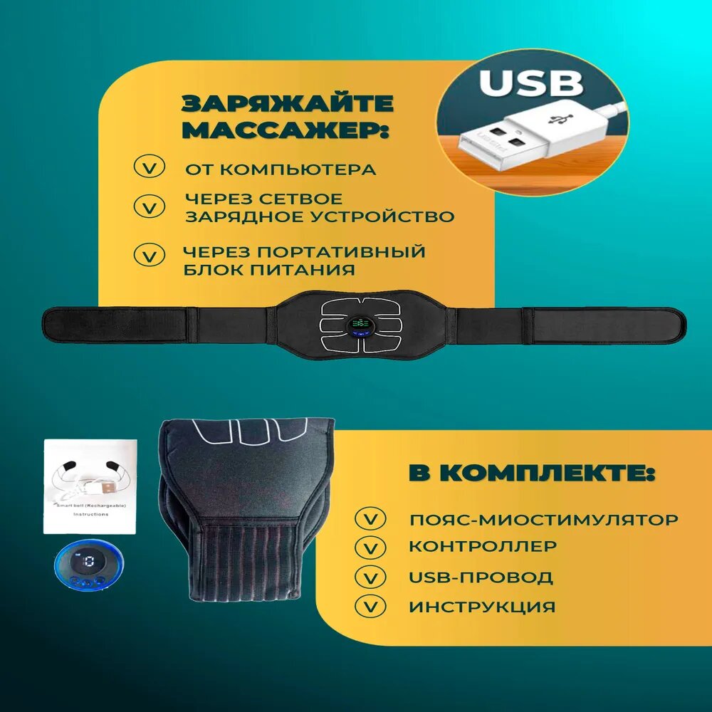 | Комплектация | Массажер электрический миостимулятор живота EMS Abdominal Toning Belt для мужчин и женщин, кабель USB, инструкция к применению |