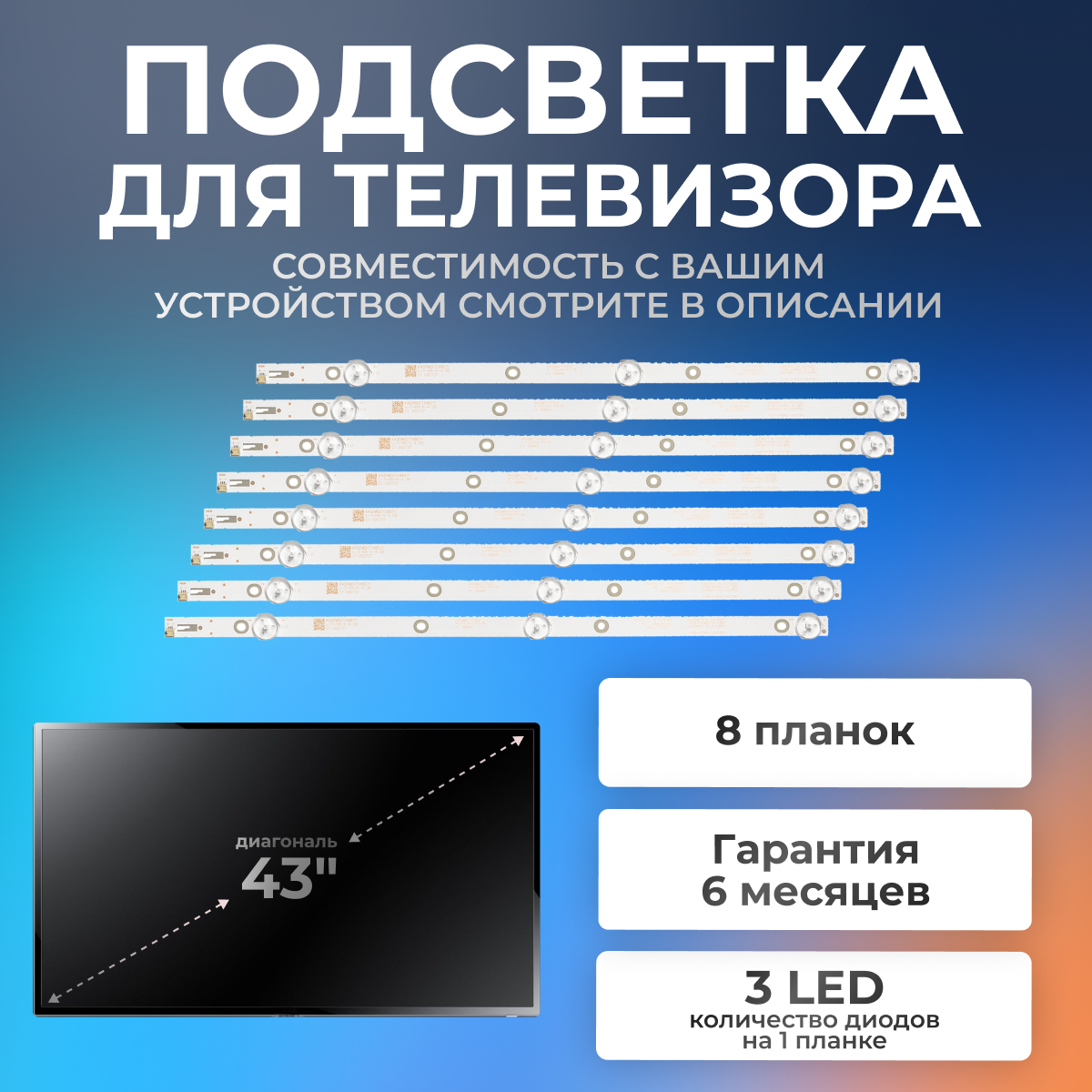 10 цен на Подсветка для телевизора Philips 43PFS4012/12, K430WDC1, AOC LE43M3570, K430WDK3, Philips 43PFS4062, 43" 6V / 3 led / (комплект 8 шт) 389mm