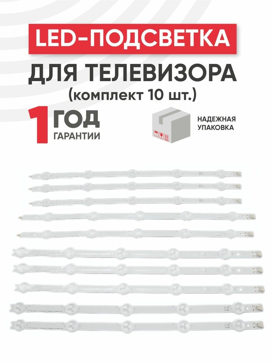 | Дополнительная информация | Комплект 10 шт: (L1-3, R1-3, L2-2, R2-2) Длина планок: L1-412 мм, R1-412 мм, L2-397 мм, R2-427 мм. Количество светодиодов: 5 шт Совместимые модели телевизоров LG: 42LA6130, 42LA6134, 42LA6136, 42LA613S, 42LA613V, 42LA6150, 42LA6154, 42LA6156, 42LA615S, 42LA615V, 42LA616V, 42LA6200, 42LA6208, 42LA620S, 42LA620V, 42LA6218, 42LA621S, 42LA621V, 42LN5130, 42LN5400, 42LN5403, 42LN5404, 42LN5405, 42LN5406, 42LN540B, 42LN540R, 42LN540S, 42LN540U, 42LN540V, 42LN541C, 42LN541U, 42LN541V, 42LN542V, 42LN543V, 42LN548C, 42LN549C, 42LN549E, 42LN5700, 42LN5707, 42LN5708, 42LN570R, 42LN570S, 42LN570U, 42LN570V, 42LN5757, 42LN5758, 42LN575R, 42LN575S, 42LN575U, 42LN575V, 42LN5778, 42LN577S, 42LN577V, 42LN5788, 42LN578S, 42LN578V, 42LN6108, 42LN610S, 42LN610V, 42LN6138, 42LN613S, 42LN613V, 42LP360H, 42LP361H, 42LP630H, 42LP631H, 42WL10MS, 42WL30MS, 42WT30MS |