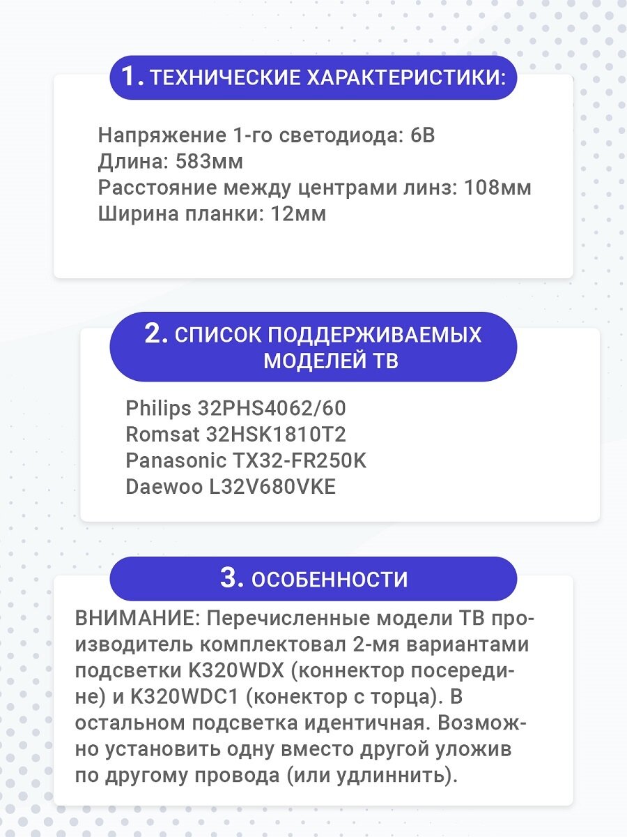 Отзывы на Подcветка K320WDX A2 для Philips 32PHS4062/60 Romsat 32HSK1810T2 Panasonic TX32-FR250K Daewoo L32V680VKE (комплект)