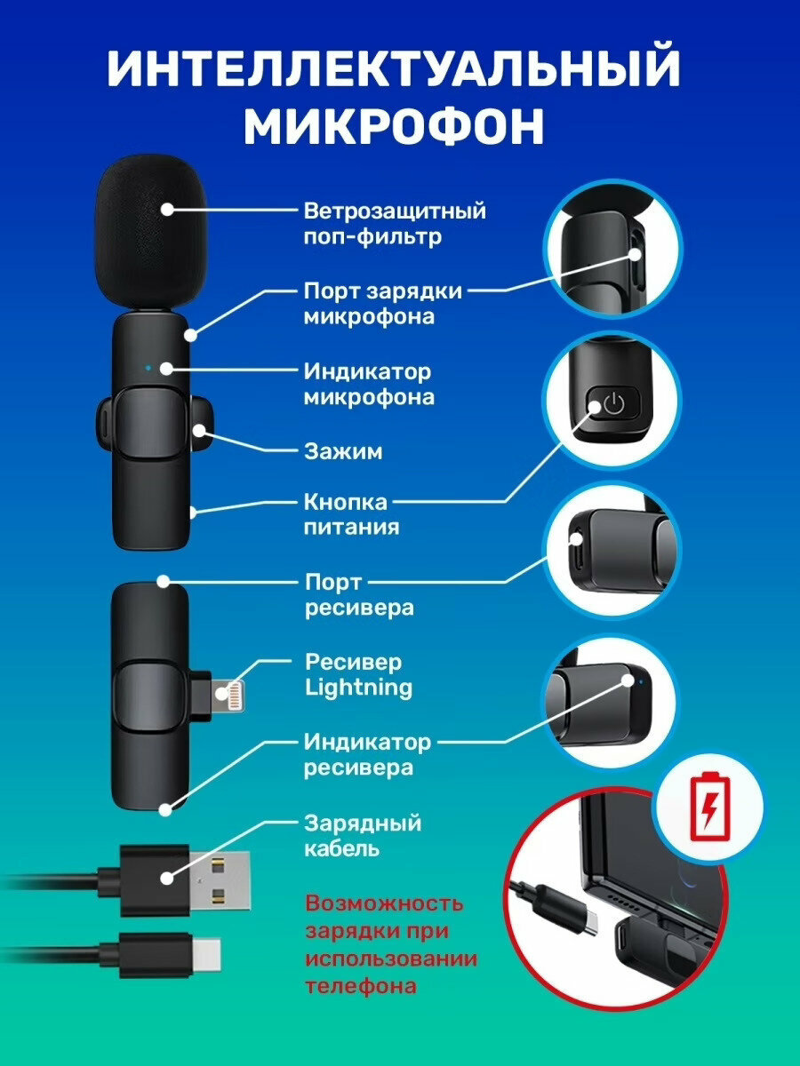 Беспроводной петличный микрофон Lightning с шумоподавлением для телефона MyLatso, смартфона iPhone Айфон, Ipod, компьютера MacBook информация: