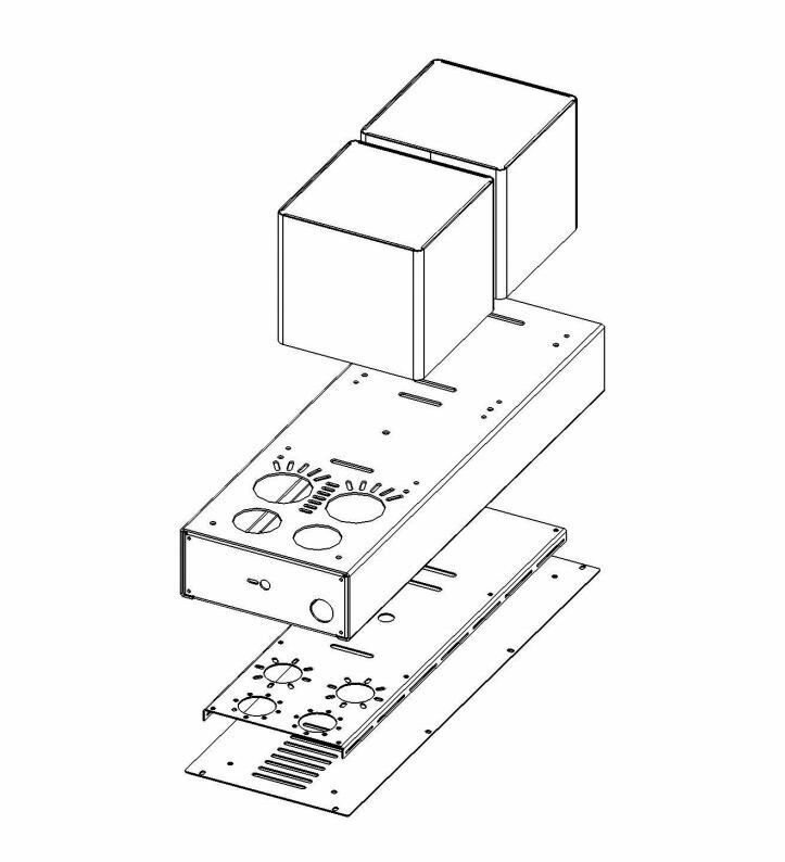 | Комплектация | 1. Шасси=2шт 2. Монтажная панель=2шт 3. Колпаки (кожухи) трансформаторов=4шт 4. Нижняя крышка=2шт 5. Метизы (винты крепления)=комплект |