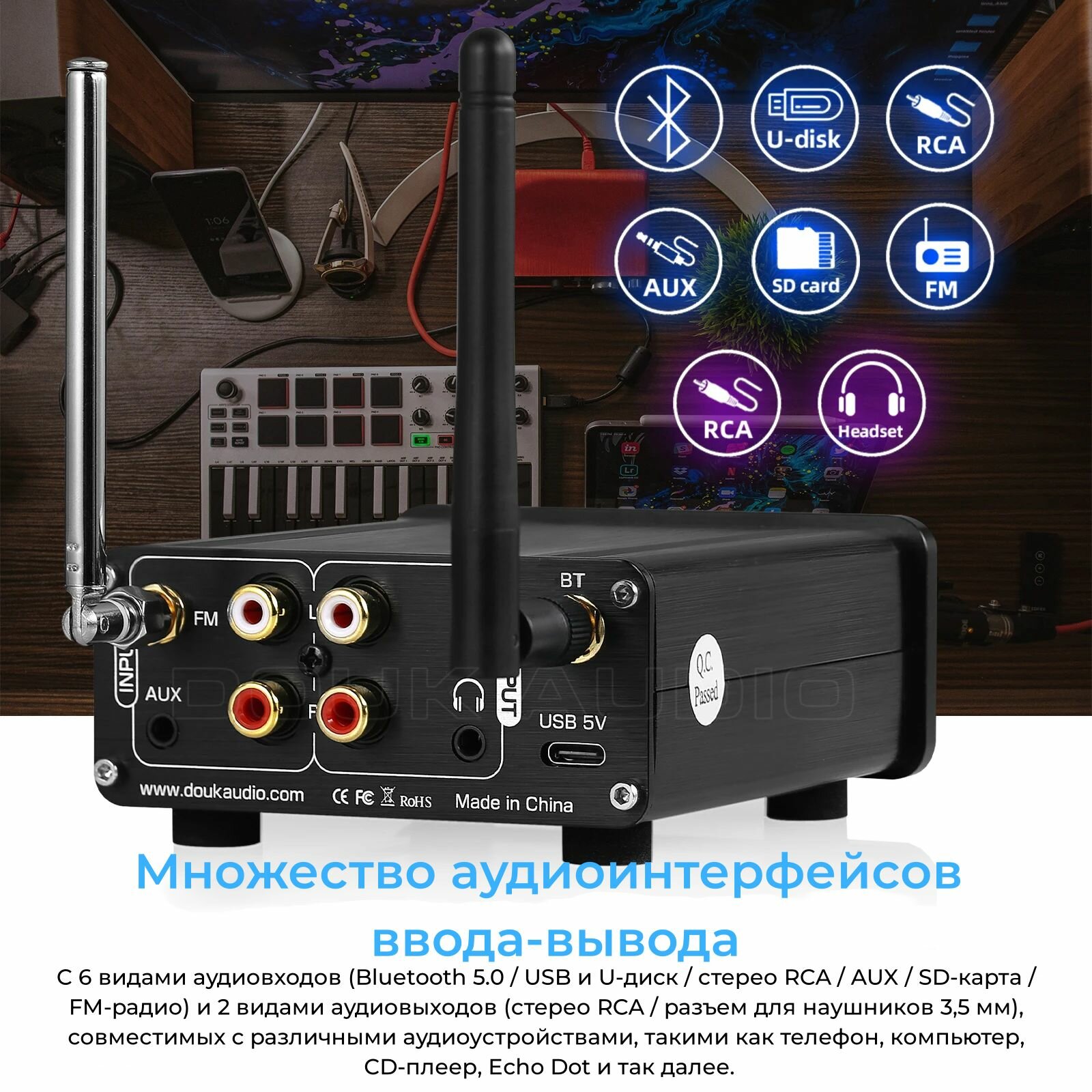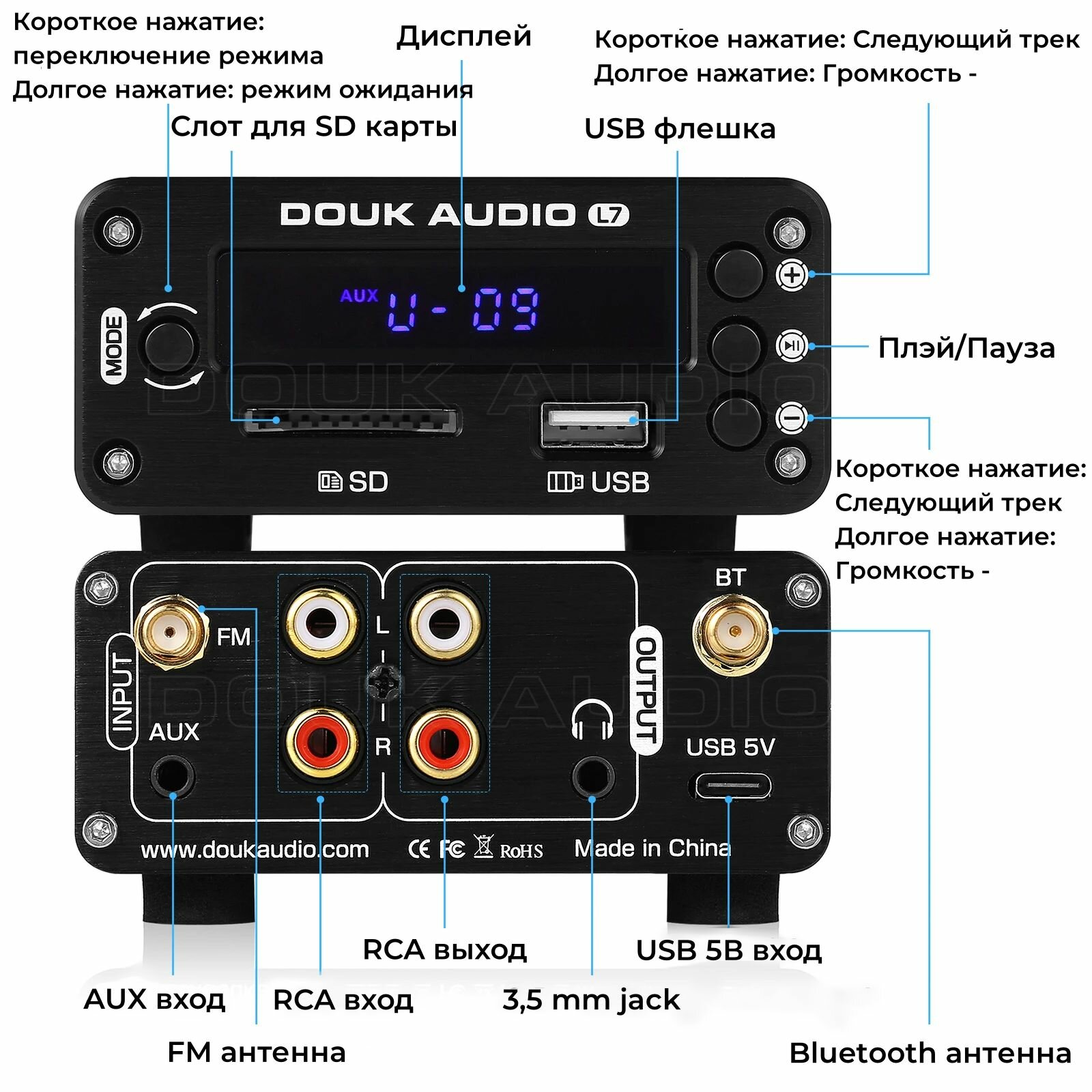 | Подробная комплектация | Douk Audio L7, Bluetooth антенна, FM антенна, кабель USB – USB Type-C, пульт ДУ |