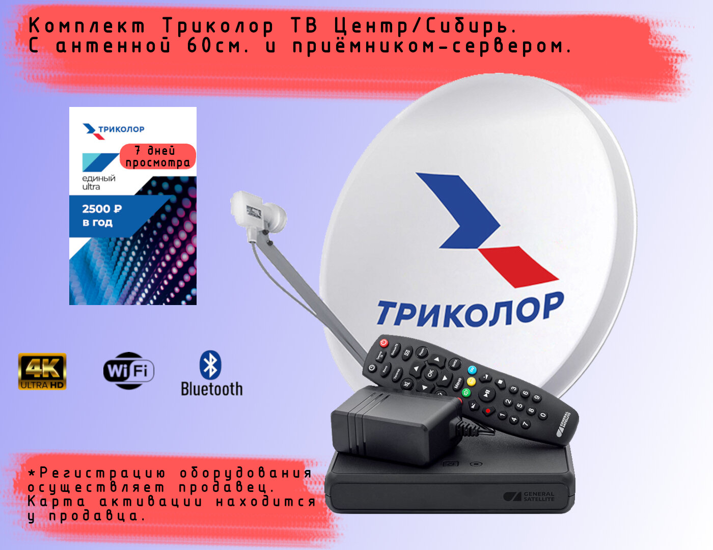 | Дополнительная информация | Внимание! Приобретая данный товар покупатель соглашается с правилами обязательной регистрации как абонента в системе Триколора через дилерский кабинет продавца, с предоставлением данных для регистрации (фамилия, имя, отчество, дата рождения, паспортные данные, адрес установки, номер мобильного телефона). Данные предоставляются продавцу исключительно для регистрации в системе Триколора. Конфиденциальность данных гарантируется. Товар является технически сложным. Исправное оборудование возврату и обмену не подлежит. |