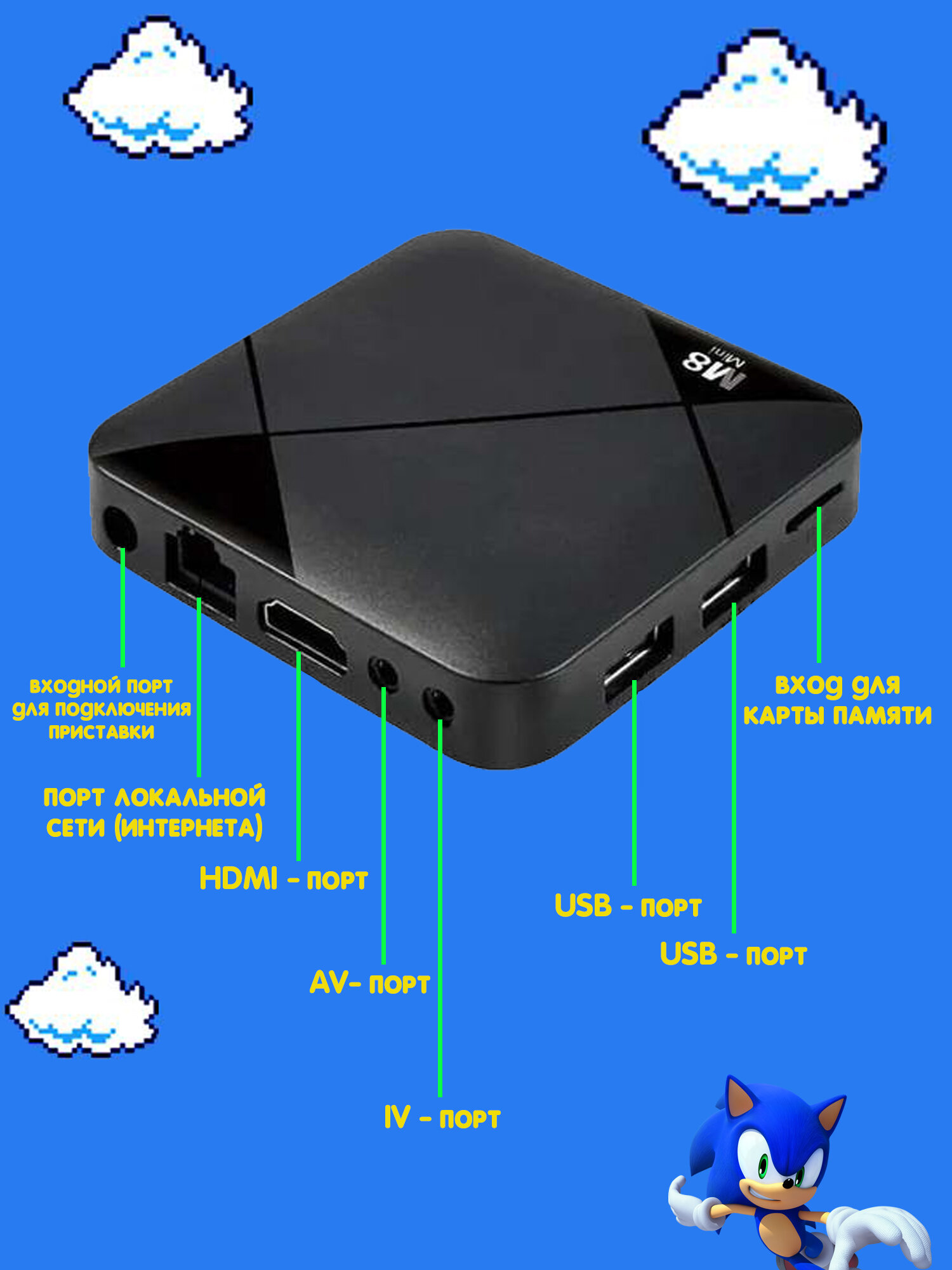 | Дополнительная информация | M8 mini Game Box 1Gb/64Gb; пульт управления; 2 беспроводных джойстика; 1 карта памяти 64Gb с играми; 1 Блок питания для зарядки; 1 HDMI-кабель; 1 -2.4G передатчик; 1 инструкция |