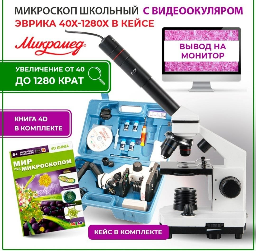 10 цен на Микроскоп Микромед Эврика 40–1280х с видеоокуляром в кейсе с книгой 4D "Мир под микроскопом"