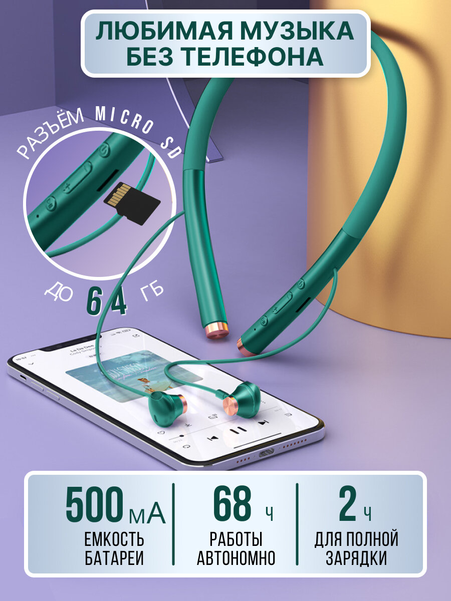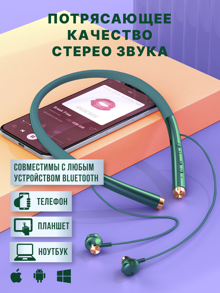Отзывы на Наушники беспроводные блютуз с микрофоном спортивные для бега на шею (WI зеленые)