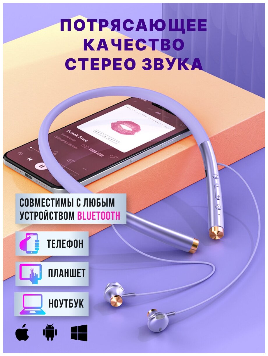 10 цен на Наушники беспроводные блютуз с микрофоном спортивные для бега на шею (WI фиолетовые)