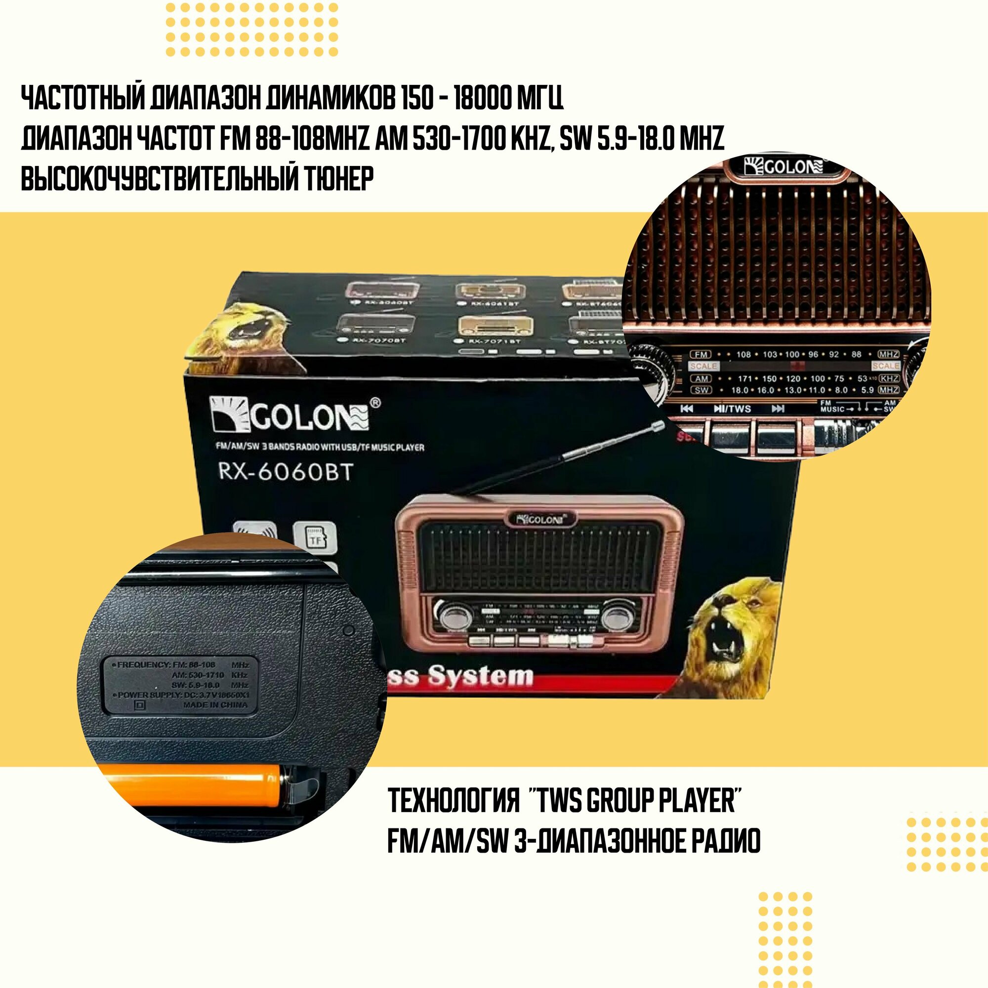 Характиристики этого товара не найдены!Отзывы на Радиоприемник RX-6060BT в стиле Ретро. Радиоприемник с хорошим приемом и звуком.