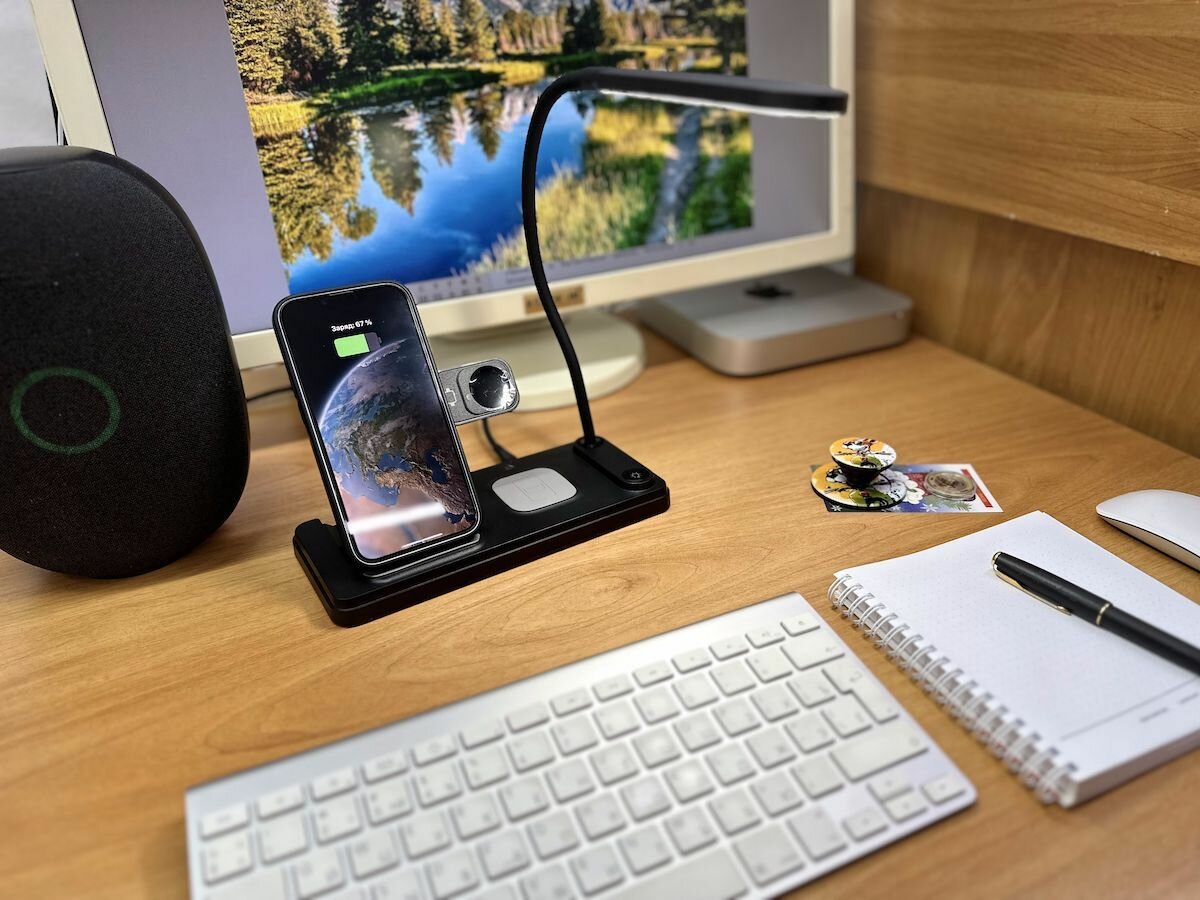 Отзывы на Док-станция с быстрой зарядкой и настольной лампой Rohs 5.0-15W(QC), 4 в 1 для телефонов и часов. Цвет черный