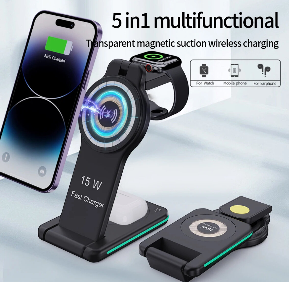 10 цен на Беспроводная зарядная станция 5 в 1 Rapture MagSafe H-60 (iMageSafe+Apple Watch+AirPods(Смартфон)+USB-A+Ночник), черная