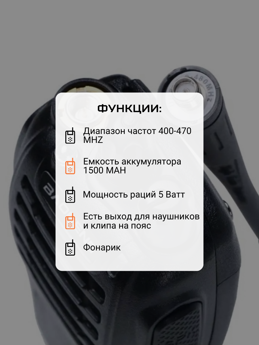 | Особенности | CTCSS, DCS, быстрая настройка на аварийный канал, программирование с компьютера, сканирование каналов, функция "нажми и говори" (PTT) |