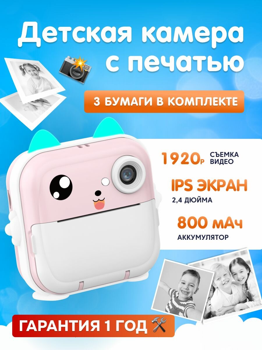 Детская камера c печатью фотографий Kid Joy, 2,4 HD экран, 1 линза, 1000мАч , угол обзора 180 градусов (P13) русская инструкция, розовая