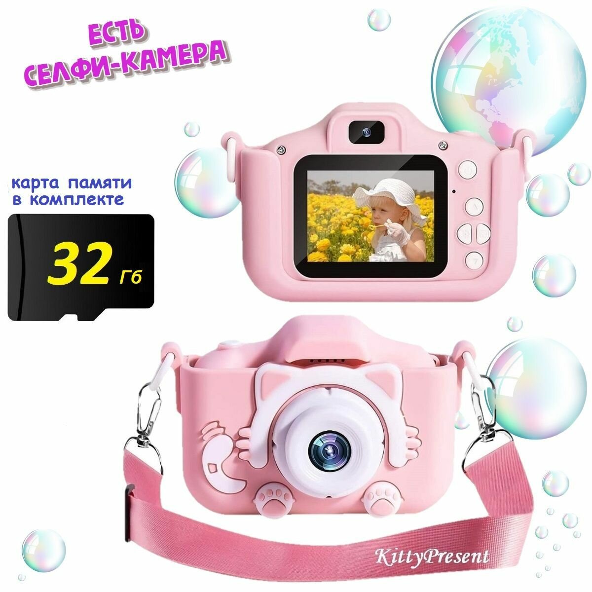 Детский фотоаппарат розовый Котик с селфи-камерой и играми + карта памяти 32 ГБ информация: