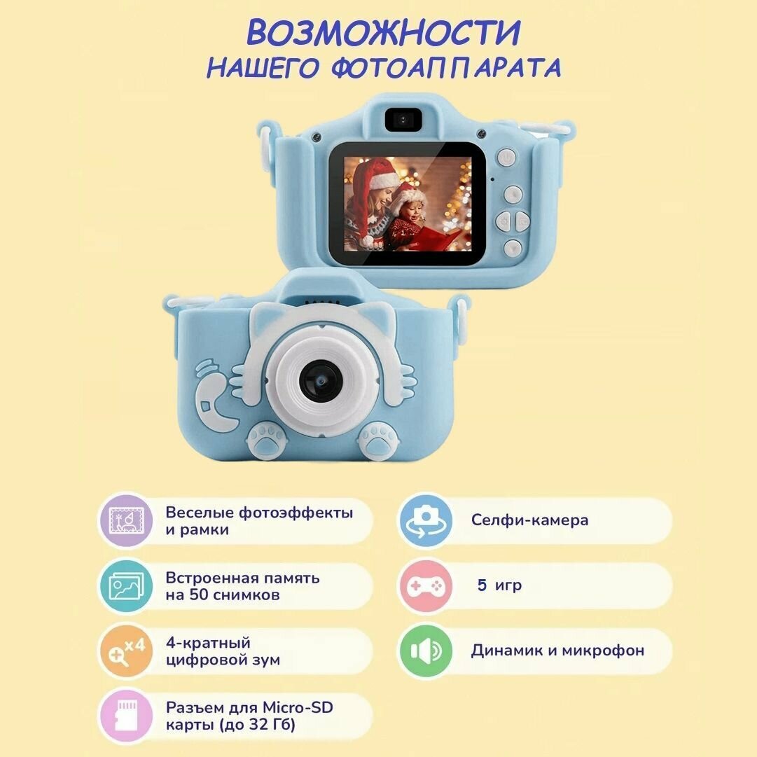 Детский фотоаппарат голубой Котик с селфи-камерой, играми + подарок информация: