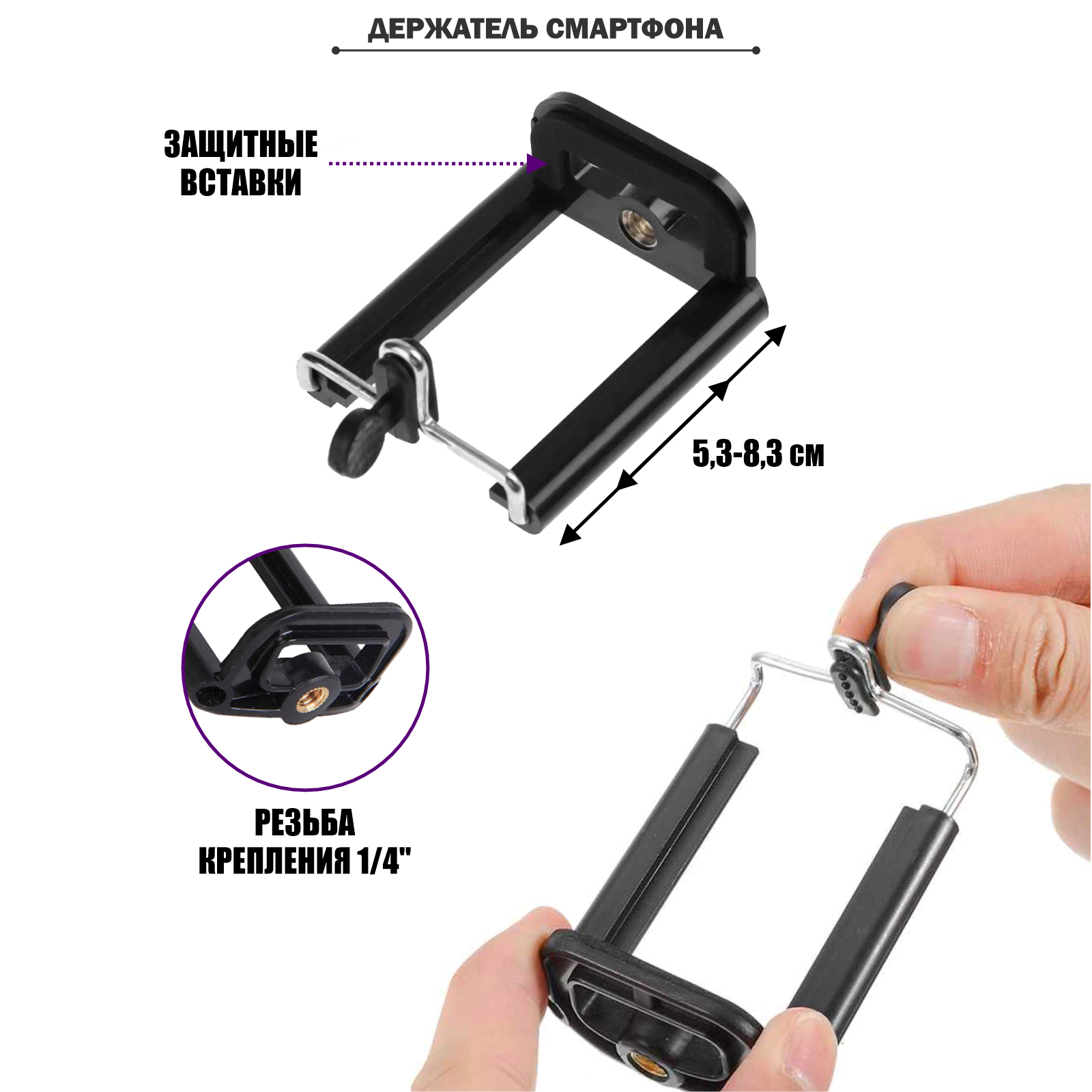 | Дополнительная информация | Один зажим для телефонов от 5,3 до 8,3 см. Второй универсальный раздвижной зажим для крепления телефона размером от 55 мм до 85 мм надежно удержит ваше устройство для горизонтальной съемки, а также он имеет два резьбовых отверстия для разных вариантов установки - для вертикального и горизонтальное положения. |