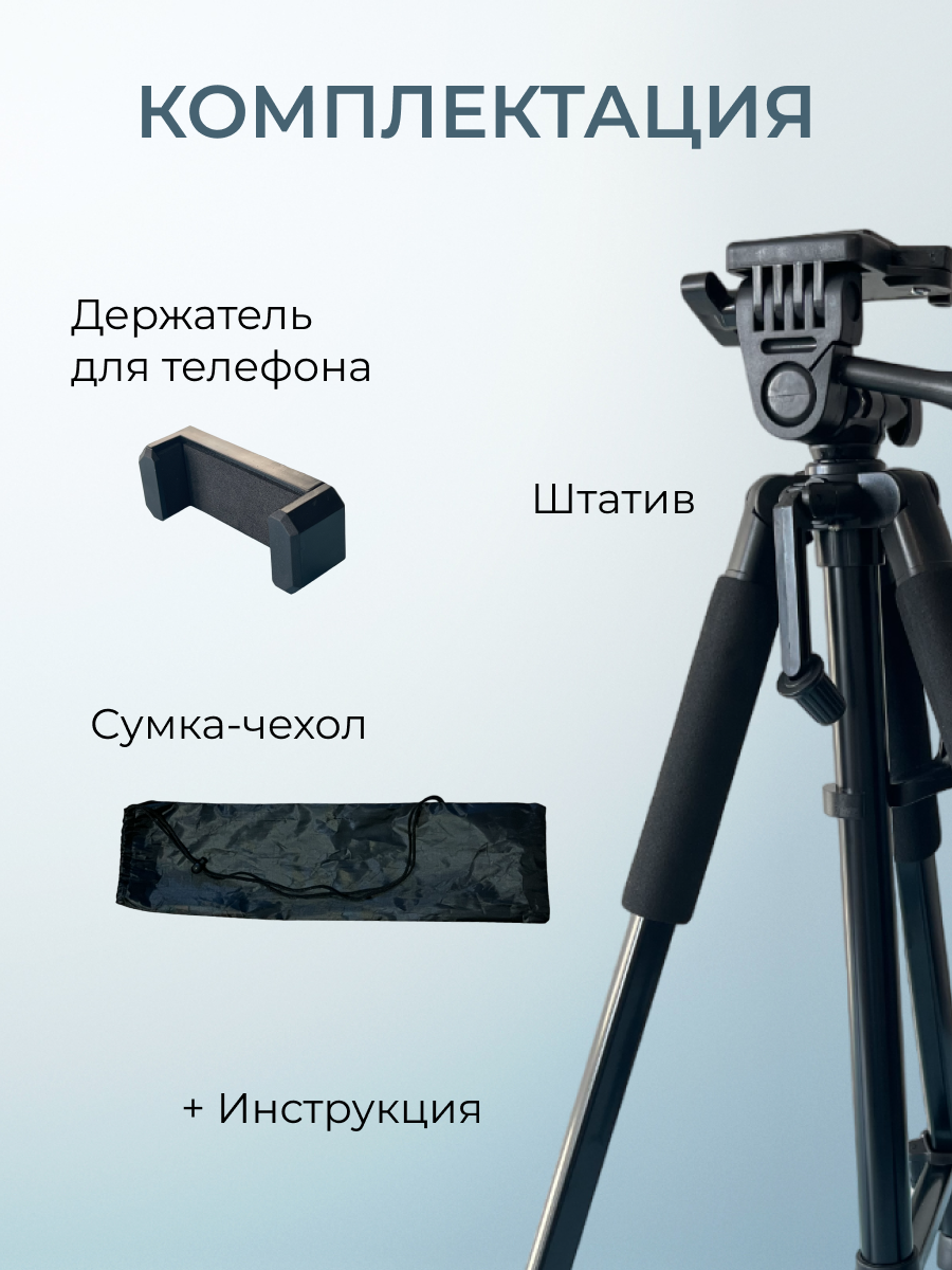 Штатив трипод для фотоаппарата, телефона, смартфона, камеры универсальный, напольный 50-140 см с держателем для телефона информация: