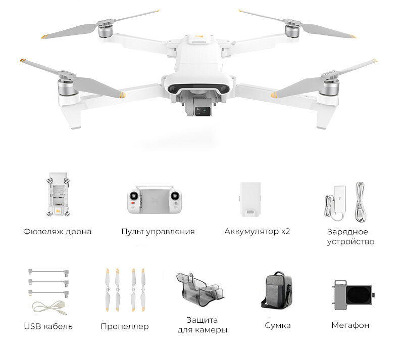 | Комплектация | Пульт управления, Аккумулятор 2 шт, Зарядное устройство, USB кабель 4 шт, Пропеллер 4 шт, Защита для камеры, Мегафон, Сумка |