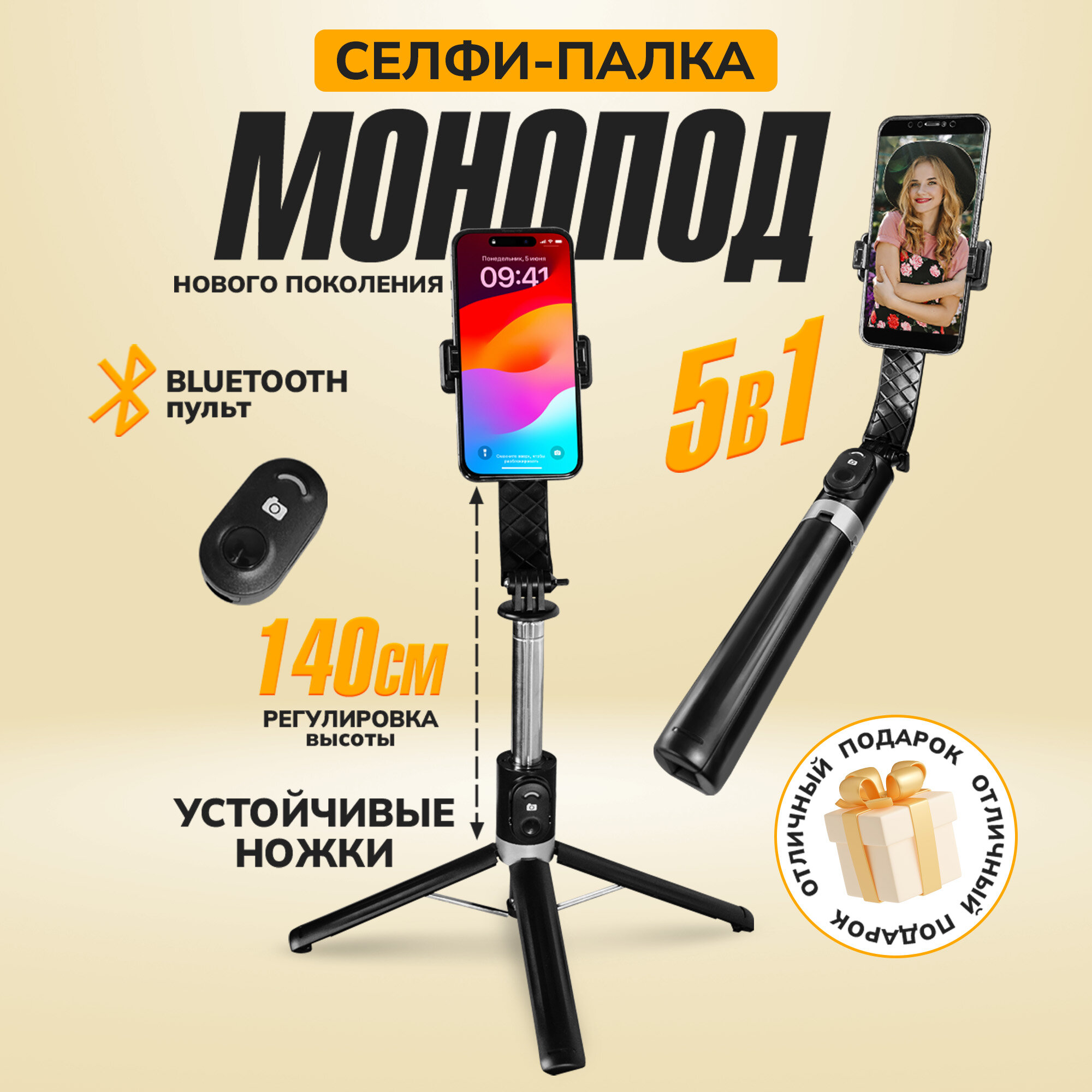 10 цен на Штатив для телефона, WALKER, WTR-55, 4 в 1, 140 см, трипод для смартфона, селфи палка, квадропод, держатель напольный, настольный, для съемки, черный