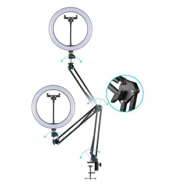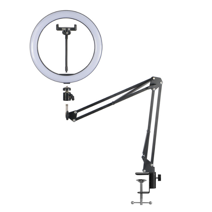 10 цен на Штатив настольный на струбцине для съемки сверху с подсветкой кольцевой лампой 26см и держателем для телефона