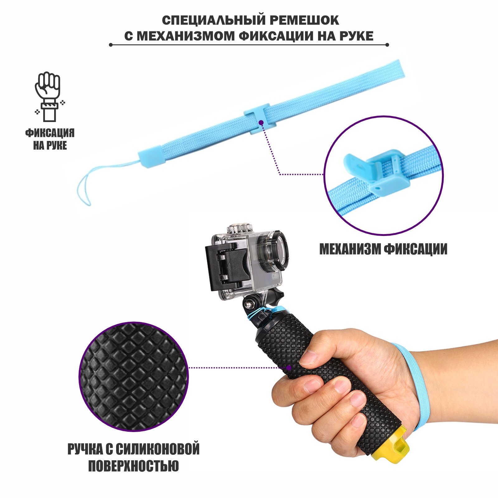 Поплавок-монопод для съемки с держателем телефона 55-85 мм и пластиковым креплением для экшн камер