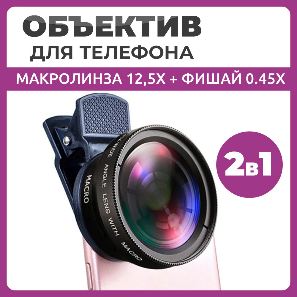 Объектив для телефона макролинза 12,5х + фишай 0.45х 2 в 1 черный информация: