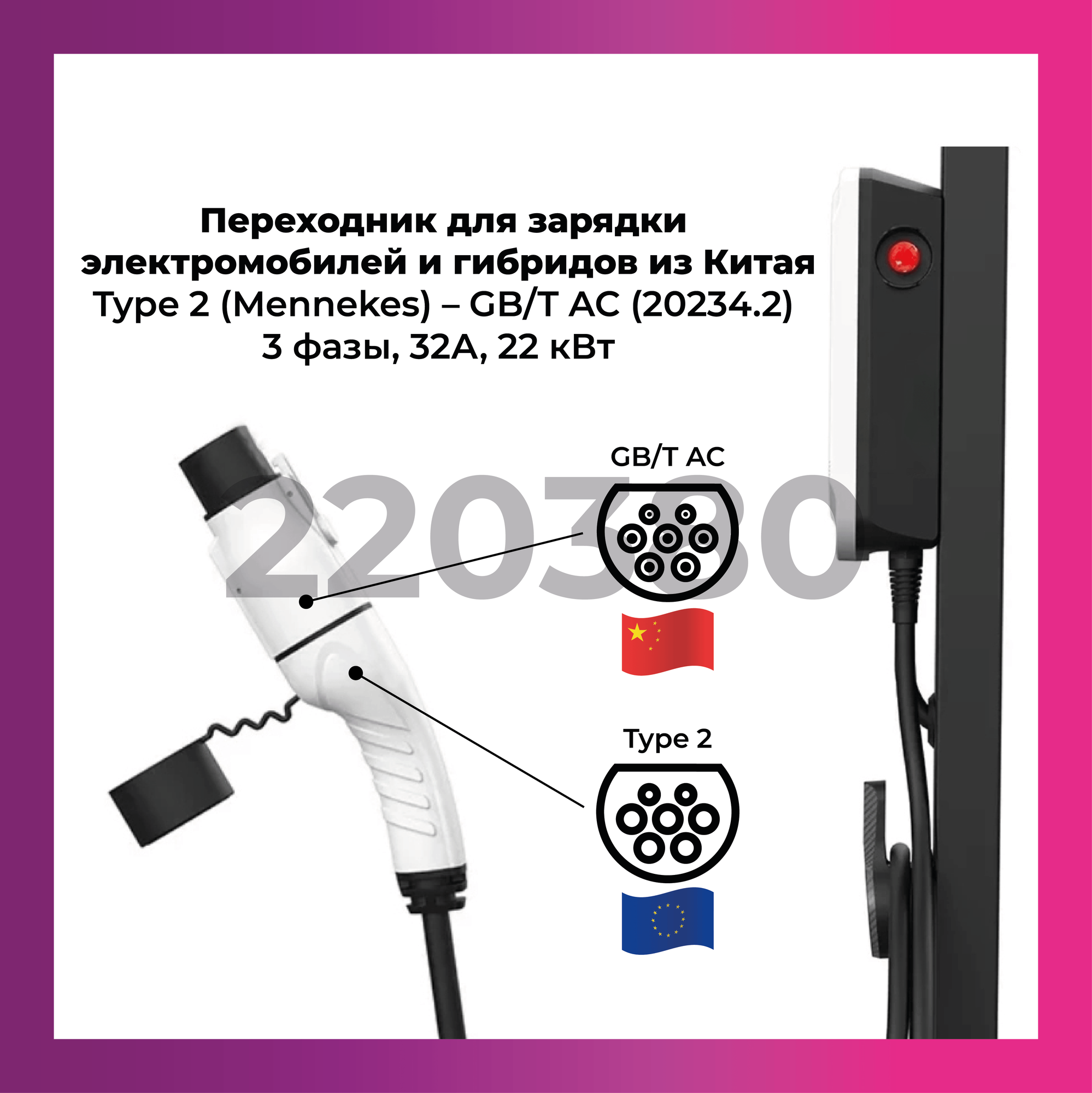 | Дополнительная информация | Адаптер предназначен для зарядки китайских электромобилей и габридов с портом GВ/Т GВТ ГБТ от зарядных станций и зарядок переменного тока с европейским стандартом Тyре2 Тyре 2 (Меnnеkеs) Тип 2 Тип2. |